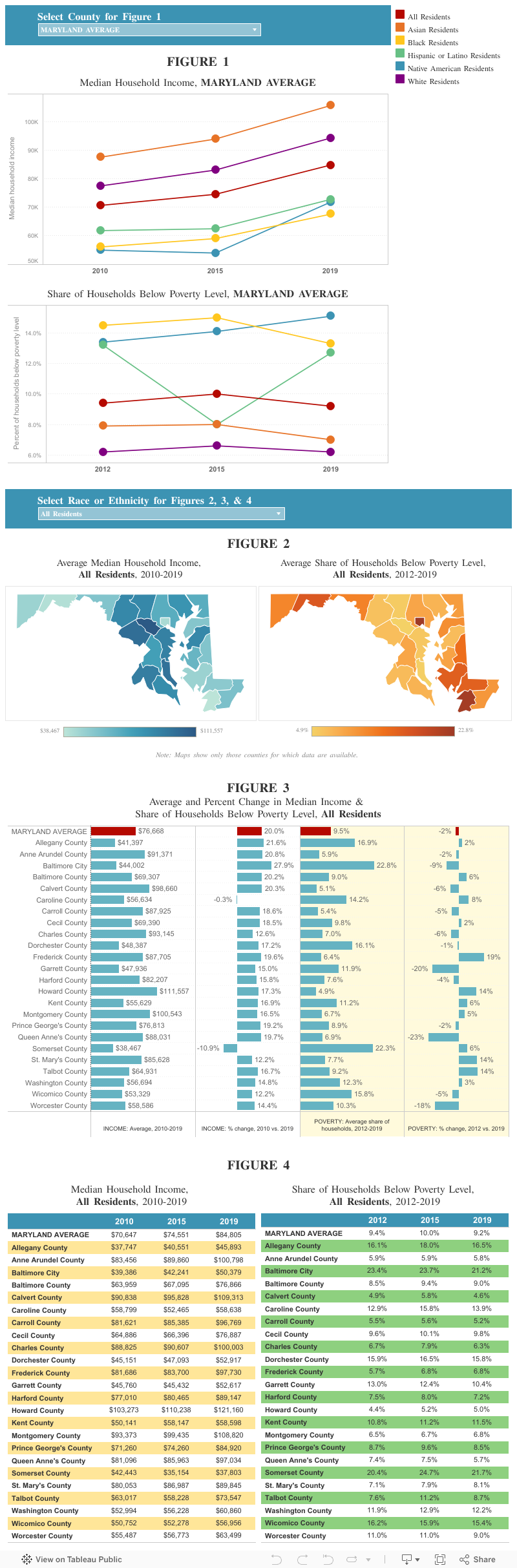 • Income and PovertyIndicators: Median household income and share of households below poverty line